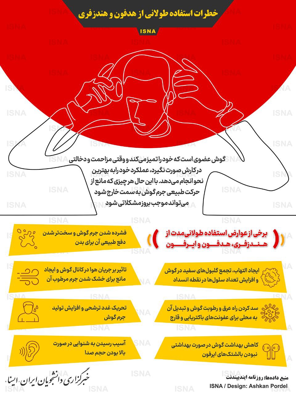 گوش عضوی است که خود را تمیز میکند و وقتی مزاحمت و دخالتی در کارش صورت نگیرد، عملکرد خود را به بهترین نحو انجام میدهد. با این حال هر چیزی که مانع از حرکت طبیعی جرم گوش به سمت خارج شود، میتواند موجب بروز مشکلاتی شود. در این اینفوگرافیک به برخی مضرات هدفون و هندزفری برای گوش اشاره شده است.