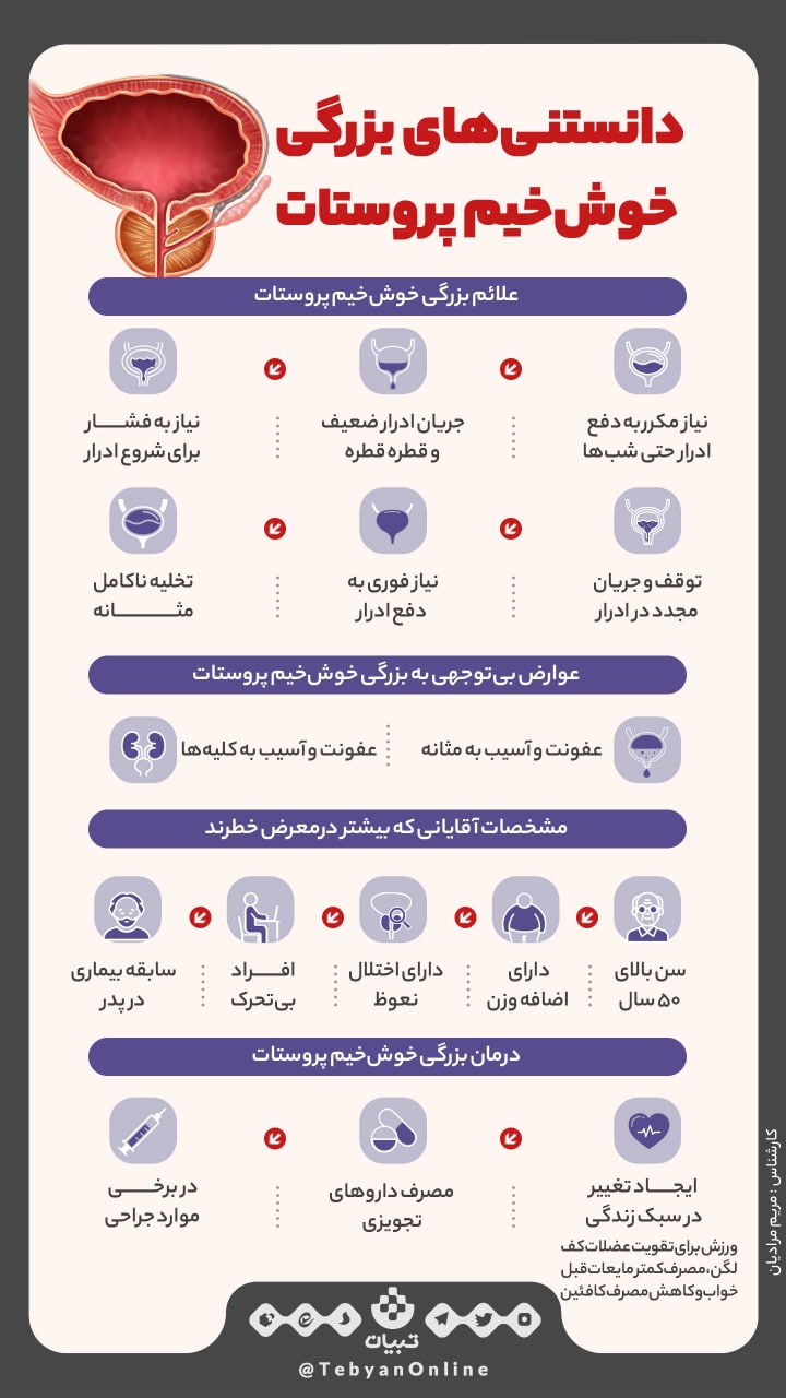 بزرگی خوشخیم پروستات شایع است؛ تقریبا نیمی از مردان بین ۵۱ تا ۶۰ سال و ۹۰ درصد از مردان بالای ۸۰ سال به این عارضه دچارند. بزرگی پروستات، خوشخیم است، یعنی سرطانی نیست و منجر به سرطان هم نمیشود؛ اما بزرگی خوشخیم پروستات و سرطان میتوانند همزمان رخ بدهند. بزرگی خوشخیم پروستات یا BPH به خودی خود ممکن است نیاز به درمان نداشته باشد؛ اما اگر علائمی ایجاد کند احتمالا نیاز به درمان دارد.