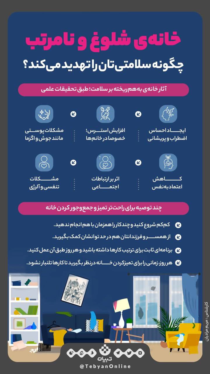 خونه شلوغ و نامرتب هم میتونه باعث ایجاد مشکلات پوستی بشه و هم آثار روانی مثل استرس و کمبود اعتماد به نفس داشته باشه.