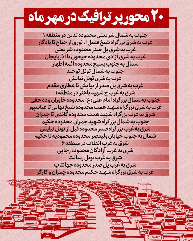 مسیرهای پر ترافیک تهران در روزهای آغاز سال تحصیلی جدید از سوی معاونت حمل و نقل و ترافیک شهرداری تهران شناسایی شده است تا مردم ضمن جلوگیری از تردد غیر ضروری در این محورها، زمان خود را مدیریت کرده و مانع قفل شدن ترافیک مهرماه در پایتخت شوند./ شهر