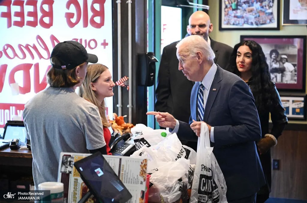 پنسیلوانیا، ایالات متحده / جو بایدن در حالی که سفارش خود را از یک ساندویچ فروشی در مون تاونشیپ تحویل می گیرد، با کارکنان صحبت می کند.