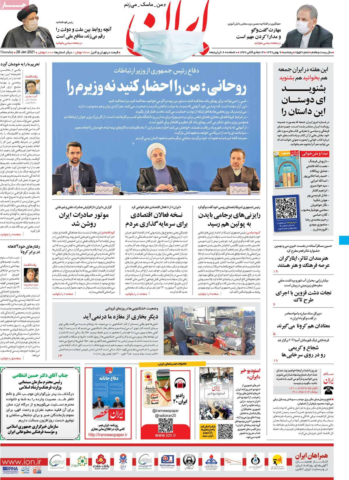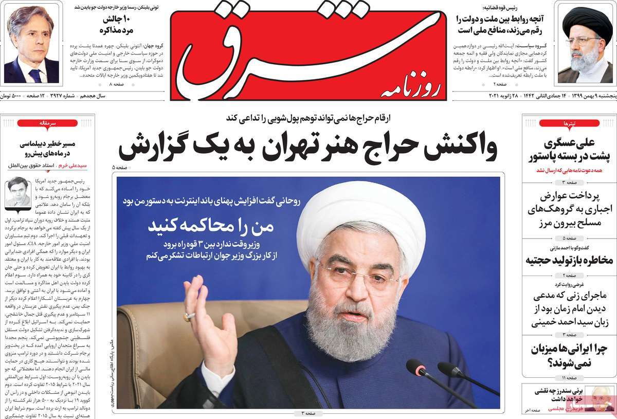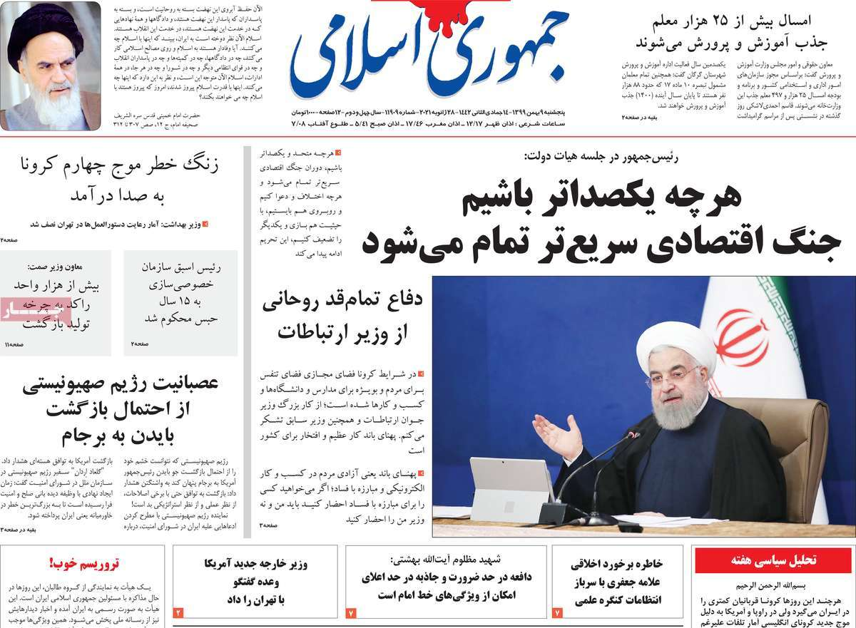 صحبتهای رییس جمهور درباره موضوع پهنای باند و دفاع او از وزیر ارتباطات بخش اصلی تیتر نخست روزنامههای کشور را در روز پنجشنبه نهم بهمن ۱۳۹۹ را به خود اختصاص داده است. خبر فوت مهرداد میناوند هم تنها به صفحه نخست یکی از روزنامهها رسیده است.