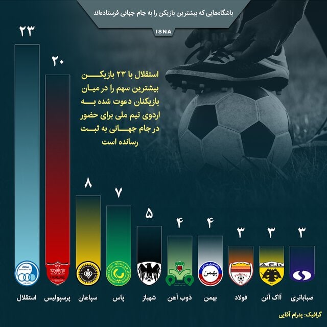 در این میان استقلال با ۲۳ بازیکن بیشترین سهم را در میان بازیکنانِ دعوت شده به اردوی تیم ملی به ثبت رسانده است و پس از آن به ترتیب پرسپولیس، سپاهان، پاس و شهباز در ردههای بعدی بیشترین بازیکنانِ دعوت شده را داشتهاند.