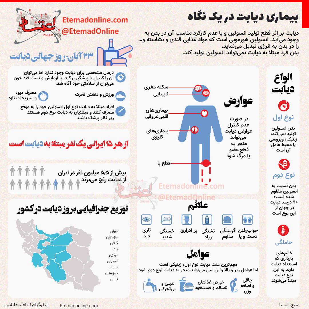 در ایران حدود بیش از ۵.۵ میلیون نفر از دیابت رنج میبرند. مهمترین علت دیابت نوع اول، ژنتیکی است. اما عواملی مثل بالا رفتن سن میتواند منجر به دیابت نوع دوم شود. به مناسبت روز جهانی دیابت، نگاهی به این بیماری میاندازیم.