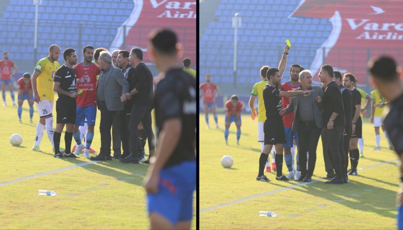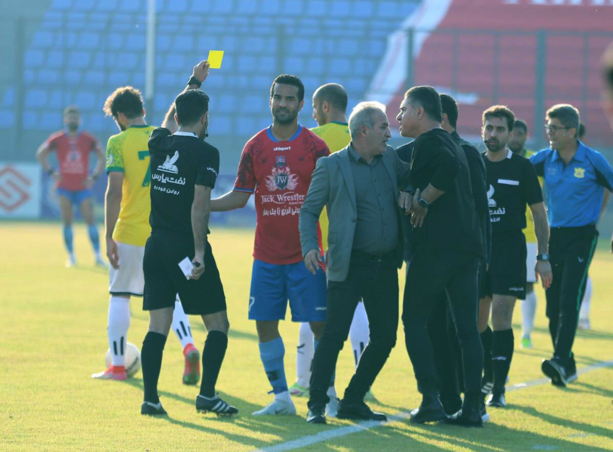 در رقابت امروز مطهری در همان نیمه اول به تصمیمات اوجاقی داور مسابقه معترض بود اما اوج اعتراضات بعد از برخورد صابر حردانی در محوطه نفت آبادان و اعلام خطا به سود نفت آغاز شد. مطهری کنار خط شدیداً به داور معترض شد و همین باعث شد داور به کنار زمین آمده و به او تذکر جدی دهد. در این لحظه سرپرست و اعضای دیگر تیم نساجی با پادرمیانی سعی در آرام کردن اوضاع داشتند اما مطهری همچنان به اعتراض ادامه داد تا اینکه مهدی اوجاقی بالاخره به او کارت زرد نشان داد.