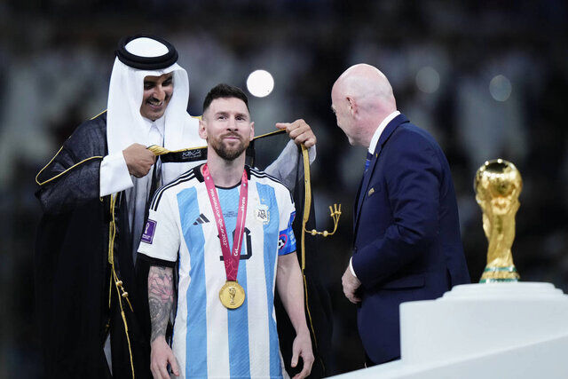 شیخ تمیم بن حمد در پی قهرمانی آرژانتین در جام جهانی ۲۰۲۲ قطر، به نشانه احترام و تقدیر، عبای عربی را بر روی دوش مسی انداخت.