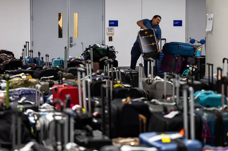 تلمبار شدن هزاران چمدان مسافری در فرودگاه شهر لس آنجلس آمریکا در پی لغو صدها پرواز به دلیل شرایط بد آب و هوایی/ گتی ایمجز