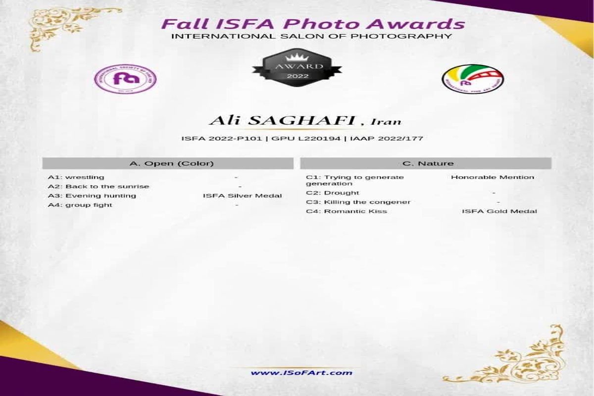 به گزارش خبرگزاری برنا از همدان، جشنواره عکس isfa کشور کانادا در سال ۲۰۲۲ زیر نظر انجمنهای GPU ، IAAP و ISFA در چهار بخش طبیعت، آزاد رنگی، پرتره و ماکرو برگزار شد که علی ثقفی عکاس هنرمند همدانی موفق به کسب مدال طلا در بخش طبیعت و ۱۵۰ دلار جایزه نقدی، مدال نقره در بخش آزاد رنگی و تقدیر هیئت داوران در بخش طبیعت شد.