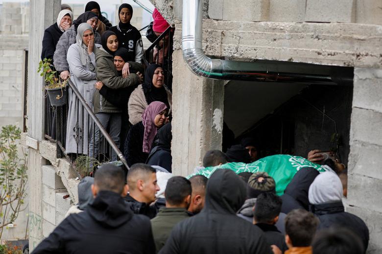 بستگان در مراسم تشییع جنازه "فواد عابد" فلسطینی که در حمله اسراییل به روستای "کفردان" در کرانه باختری اشغالی به شهادت رسیده است./ رویترز