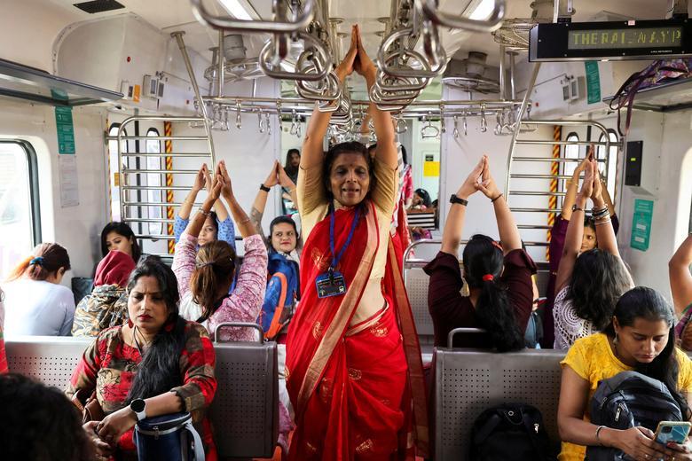 تمرین یوگا به مناسبت روز جهانی زن در یک قطار شهری در بمبئی هند/ رویترز