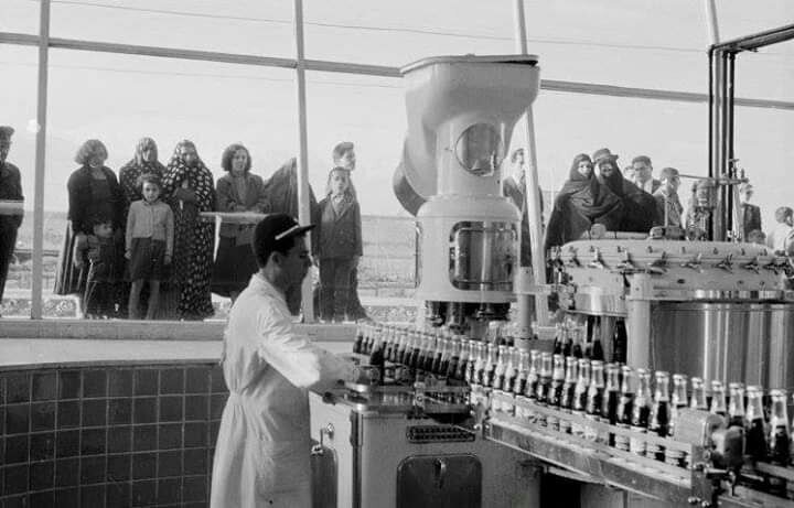 دهه ۳۰ و ۴۰ شمسی زمان توسعه صنعت در بخشهای مختلف در ایران بود و از همین رو دستگاههای غول پیکر صنایع و تکنولوژیهای جدید برای مردم جذاب بود. یکی از صنایع جذاب در دهه ۳۰، خط تولید نوشابه کوکاکولا بود که مردم می توانستند از پشت شیشه روش تولید و بسته بندی آن را تماشا کنند. در تصویر زیر این موضوع کاملا عیان است، گویی این کارخانه یک موزه زنده بوده که همه جزییات آن برای مردم دیدنی است. منبع: همشهری آنلاین