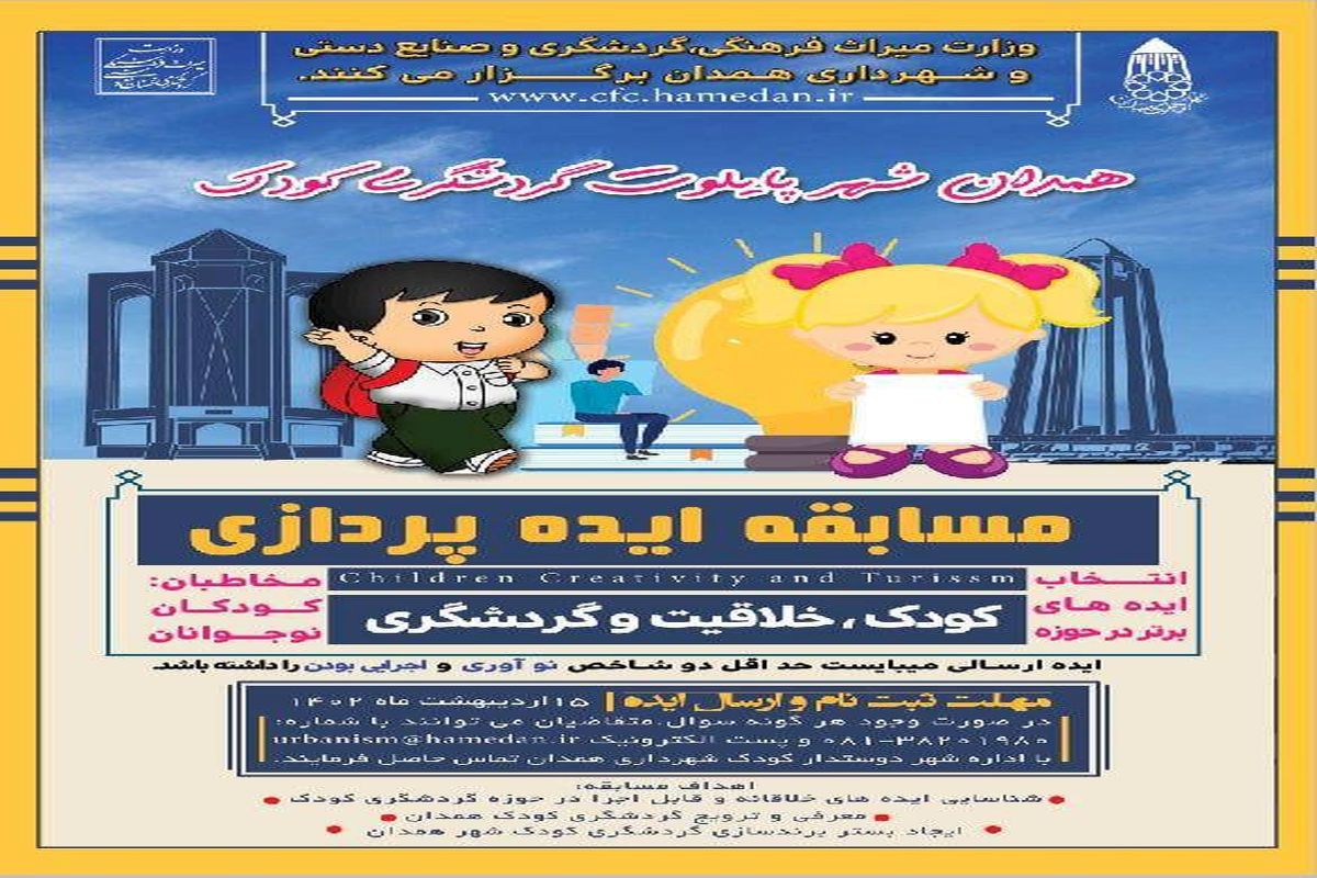 به گزارش خبرگزاری برنا، در راستای انتخاب شهر همدان بهعنوان شهر پایلوت گردشگری کودک و با هدف شناسایی ایدههای خلاقانه و قابل اجرا در این حوزه، مسابقه ایدهپردازی کودک، خلاقیت و گردشگری، ایدههای کودکان و نوجوانان با مشارکت میز گردشگری کودک و نوجوان وزارت میراثفرهنگی، گردشگری و صنایعدستی و شهرداری همدان ، برای دو گروه سنی کودکان ۱۲-۶ سال و نوجوانان ۱۸-۱۲ برگزار میشود.