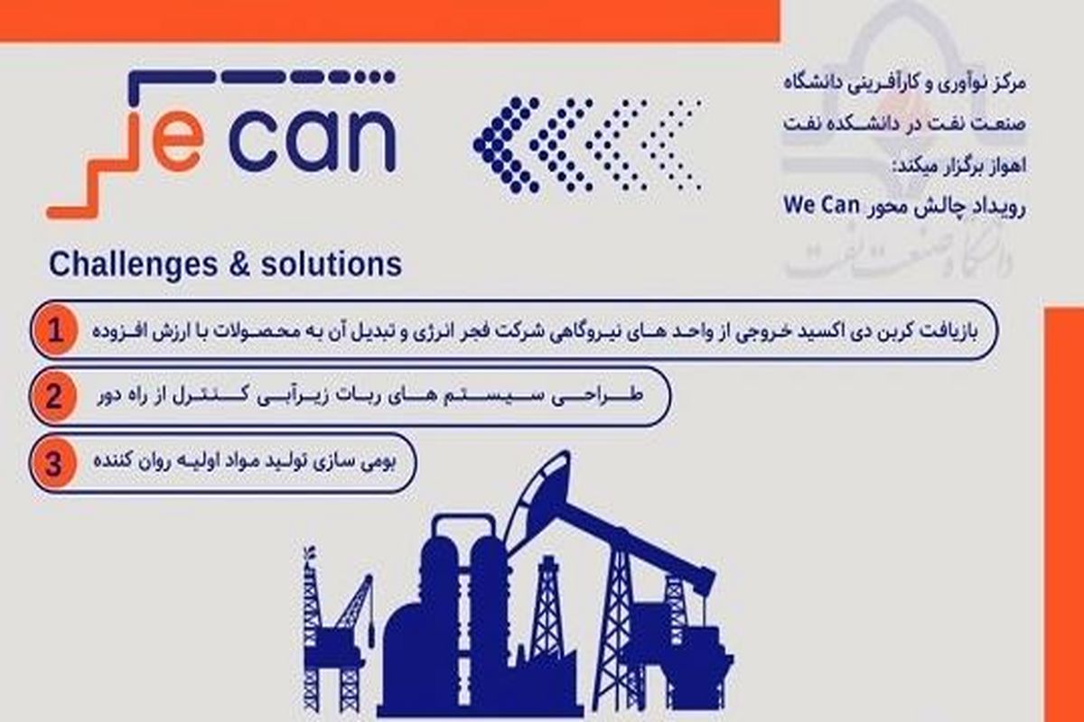 خبرگزاری برنا؛ مرکز نوآوری و کارآفرینی دانشگاه صنعت نفت در دانشکده نفت اهواز به منظور شناسایی، هدایت، رشد، شکوفایی و فراهم آوردن زمینههای بهرهمندی از توان دانشجویان و پژوهشگران مستعد حوزههای بالادستی و پاییندستی صنعت نفت و گاز، نخستین دوره رویداد ملی مسئلهمحور We Can را با هدف حل مشکلات و چالشهای پیش روی این صنعت، در چارچوب طرح توسعه رویدادهای رقابتی مسئلهمحور بنیاد ملی نخبگان برگزار میکند.