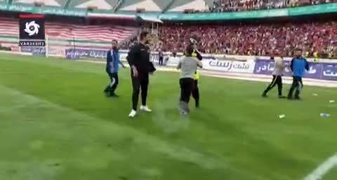 صحنه درگیری مهدی عبدی، بازیکن پرسپولیس با یکی از عوامل ورزشگاه در پایان مسابقه را ببینید.