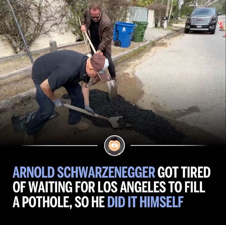 آرنولد شوارتزنگر، ستاره فیلم های اکشن و فرماندار سابق کالیفرنیا، پس از چندین هفته انتظار برای حل مشکل چاله خیابان محل زندگی اش، خود دست به کار شد. شوارتزنگر ۷۵ ساله در ویدیویی که در صفحه توییتر خود منتشر کرد، تلاش می کند تا چاله بزرگی را که به گفته او هفتهها است که محلهاش را گرفتار کرده است پر کند.