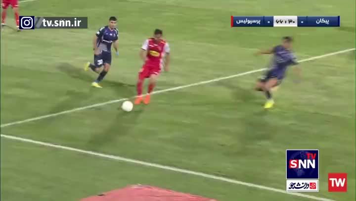 صحنه مشکوک به پنالتی در محوطه جریمه پیکان که داور اعتقادی به خطا نداشت.
