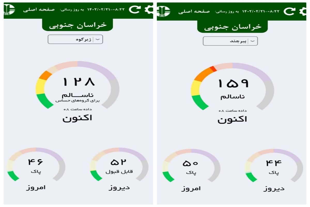 اسدالله حاتمی افزود: بر اساس شاخص ۲۴ ساعته مختوم به ساعت ۸ صبح امروز ۲۲ اردیبهشت شهرستان زیرکوه با شاخص ۱۲۸ در شرایط ناسالم برای گروههای حساس و شهرستان بیرجند با شاخص ۱۵۹ در وضعیت ناسالم قرار گرفت.