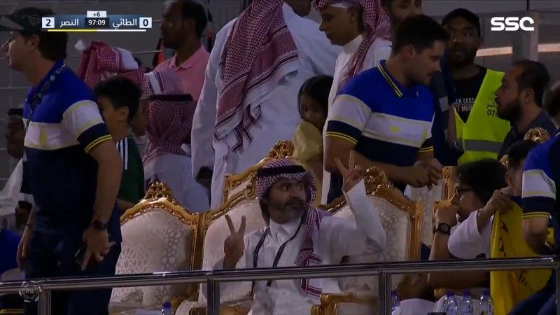 اما نکته اصلی شادی هواداران النصر جایی است که عبدالله العمرانی، نائب رئیس باشگاه النصر پس از اینکه برای مشاهده دیدار همزمان از جایش بلند شده، با به ثمر رسیدن گل تساوی الهلال برابر الاتحاد، به صندلی خود برمیگردد و سپس برای دیگر مدیران النصر که در جایگاه ویژه حضور دارند، نتیجه 2 بر 2 را با دستانش نشان میدهد و سریعا دستش را زیر چانه گذاشته و تلاش میکند چهره خود را بابت گلزنی رقیب همشهریاش، خوشحال نشان ندهد.