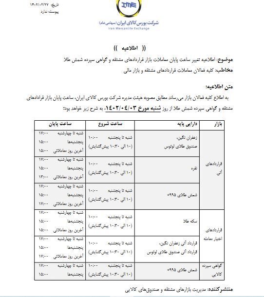 به گزارش خبرگزاری صداوسیما، براساس اطلاعیه مدیریت بازارهای مشتقه و صندوقهای کالایی بورس کالای ایران،از روز سه شنبه ۳ تیر ساعت پایان بازار قراردادهای مشتقه شامل آتی و اختیار معامله شنبه تا چهارشنبه ساعت ۱۷ و پنجشنبهها و آخرین روز معاملاتی ساعت ۱۵ اعلام شده است.