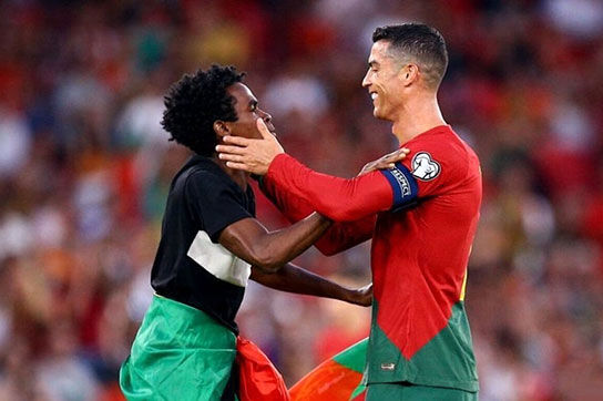 لحظه دیدار فرا رسید؛ لحظهای که خیلی باشکوه شروع شد و باشکوهتر هم به پایان رسید. این هوادار ابتدا مقابل پای ستاره پرتغالی تعظیم کرد تا میزان علاقه بالای خود را نشان دهد. او سپس از جای خود بلند شده و کریستیانو رونالدو را در آغوش گرفت و به هوا برد. فوق ستاره پرتغالی مات و مبهوت خود را به دست سرنوشت سپرده بود و اعتراضی به این هواداران قانون شکن و برنامههای متنوع او که باعث توقف بازی شده بود نداشت.