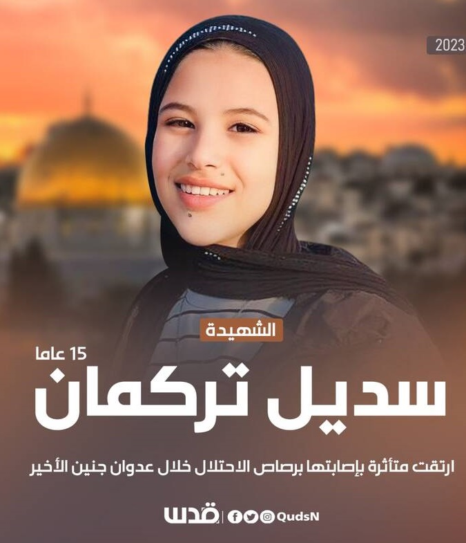 سدیل نغنیه دختر ۱۵ ساله فلسطینی که در حمله اخیر نظامیان رژیم صهیونیستی به جنین زخمی شده بود به شهادت رسید. وی در حالی که در حیاط جلوی خانهاش بوده از ناحیه سر مورد اصاب گلوله مستقیم قرار گرفته بود.
