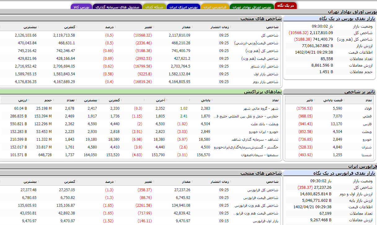 نمادهای فولاد، فارس، وبملت، فولاد، خودرو، شستا، فملی و شتران از نمادهای تاثیرگذار منفی بر شاخص کل بورس هستند.