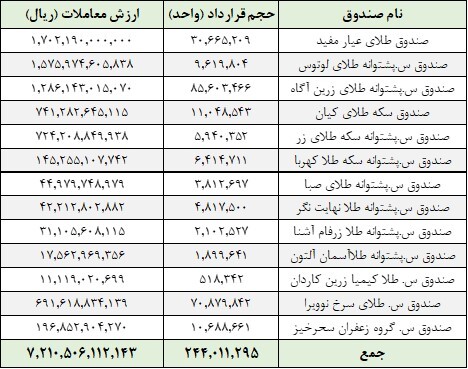 به گزارش خبرگزاری صداوسیما به نقل از کالاخبر، در هفتهای که گذشت، ۱۱ صندوق فعال در حوزه طلا و ۲ صندوق فعال در حوزه زعفران در مجموع ۲۴۴ میلیون و ۱۱ هزار و ۲۹۵ واحد صندوق به ارزش بیش از ۷۲۱ میلیارد تومان معامله شد.