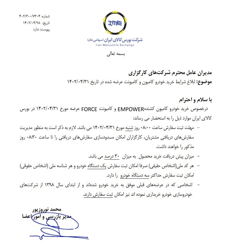 به گزارش خبرگزاری صداوسیما به نقل از کالاخبر، در نامه مدیر بازرسی و امور اعضا بورس کالای ایران درخصوص خرید خودرو کامیون کشنده امپاور و کامیونت فورس که قرار است شنبه ۳۱ تیر عرضه شود آمده است: