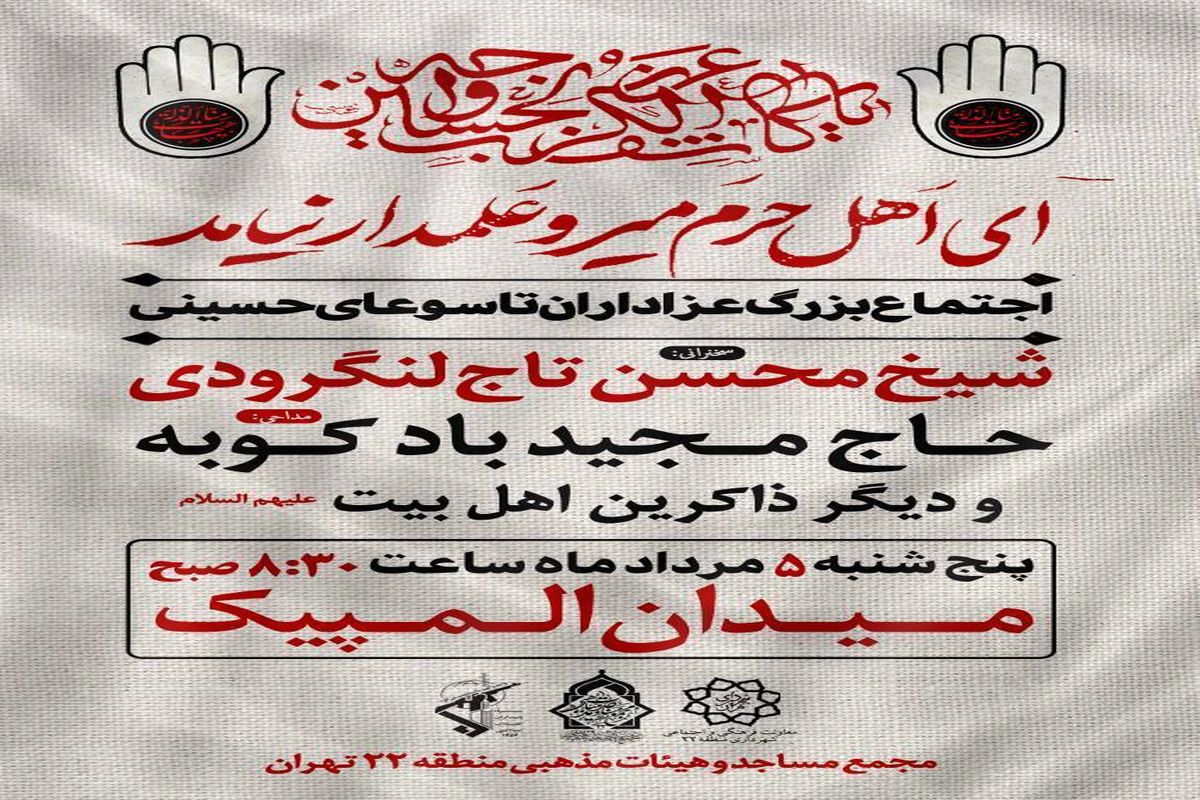 به گزارش خبرگزاری برنا، شرفی شهردار منطقه 22 تهران ضمن دعوت از مردم برای حضور در این اجتماع گفت: در این برنامه معنوی، مردم در سوگ شهادت حضرت ابالفضل (ع) و شهدای کربلا با پرچمهای یاحسین (ع) به اجرای برنامه سینه زنی، مرثیه سرایی، روضه، نوحهخوانی و عزاداری می پردازند و به یاد ایثار و رشادتها و در رثای علمدار رشید کربلا عزاداری می کنند.