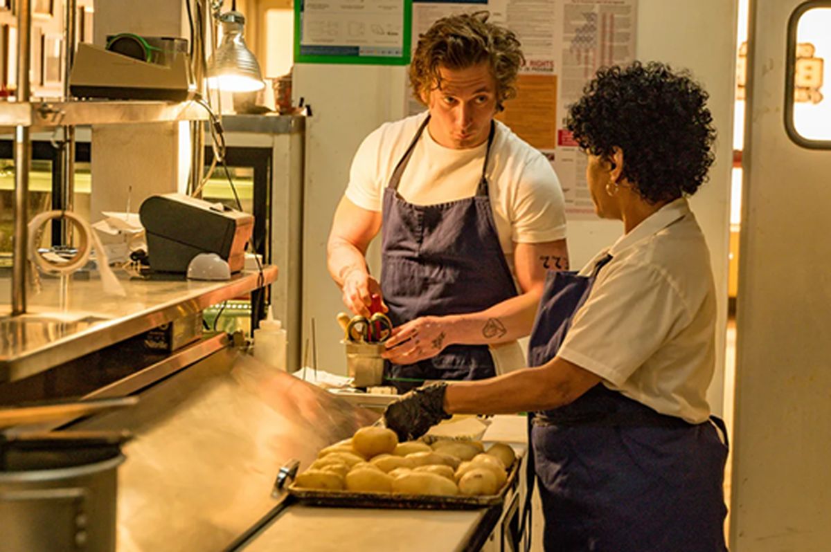 همچنین The Bear با واقعگرایی مثالزدنیای ما را دقیقا به دنیای پشت یک رستوران کوچک میبرد. استورر موفق میشود فضای یک آشپزخانه را با همه آشفتگیها، تنشها و استرسهایش به شکل ملموسی به تصویر بکشد. او و همکاران فیلمنامهنویسش در تصمیمی جسورانه هر شاخ و برگ داستانی اضافهای که میتوانست به این اتمسفر ویژه و واقعگرایانه لطمه بزند را کنار گذاشتهاند. ما حتی شخصیتها را بیشتر از آنکه در خلوتهایشان بشناسیم در خلال همین مراودات روزمره در محیط کار و تعاملهای دو نفره کوتاهشان است که میشناسیم.حتی برخی از این شخصیتها را به غیر از محیط آشپزخانه در جایی دیگر نمیبینیم. بهعنوان نمونه شخصیت مایکل که یک فرزند دارد و از همسرش جدا شده است را هیچ وقت درکنار فرزندش نمیبینیم. بلکه فقط از طریق دو صحنه کوتاه و دیالوگهای او با دختر و همسر سابقش از آن مطلع میشویم اما با این حال از طریق مراودات روزانه معمولا تنشآمیز او و از درون سادهترین موقعیتها به درون رنجور و آسیبدیدهاش پی میبریم.