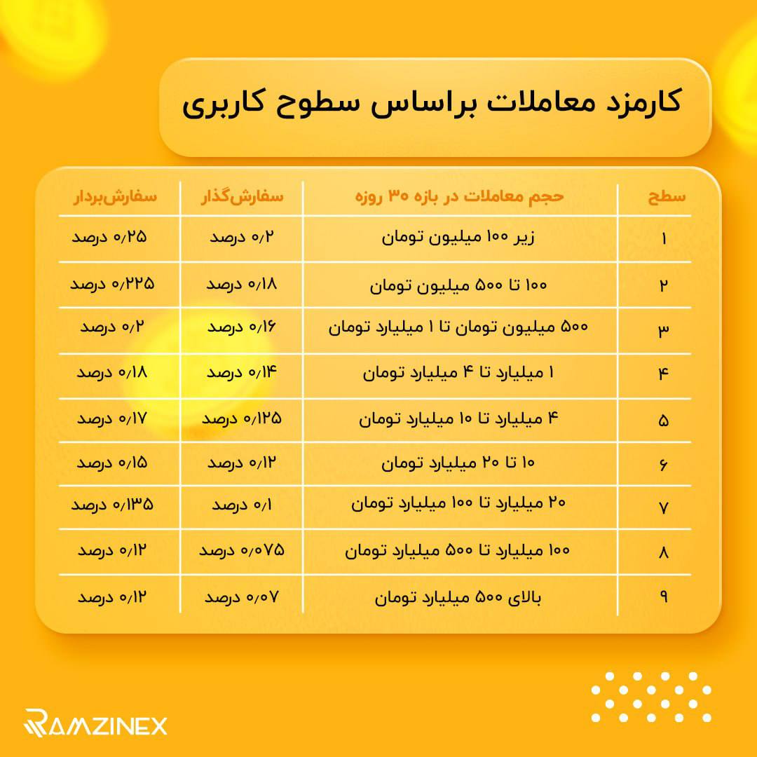 سطح بندی کارمزدها در رمزینکس به ۹ قسمت تقسیم میشود؛ کارمزد معاملات سطح یک که برای حجم معاملات زیر ۱۰۰ میلیون تومان تعریف شده است، برای سفارشگذار ۰.۲ درصد و برای سفارشبردار ۰.۲۵ درصد است.