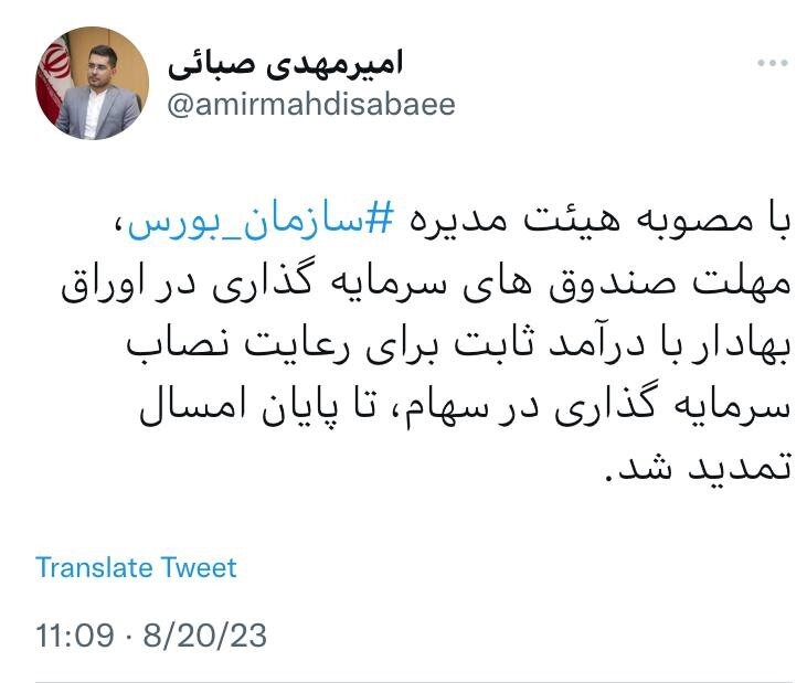 به گزارش خبرگزاری صداوسیما، امیرمهدی صبائی، سخنگوی سازمان بورس در فضای مجازی نوشت: با مصوبه هیئت مدیره سازمان بورس، مهلت صندوقهای سرمایه گذاری در اوراق بهادار با درآمد ثابت برای رعایت نصاب سرمایه گذاری در سهام، تا پایان امسال تمدید شد.
