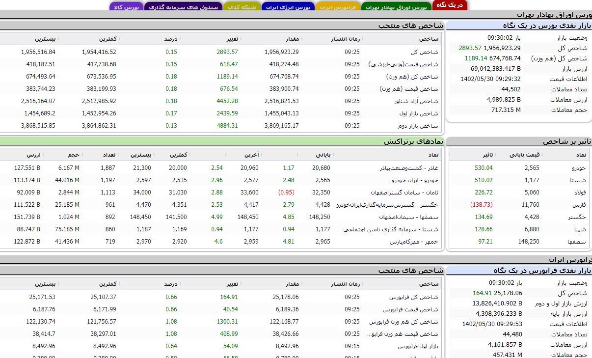 شاخص کل بورس اوراق بهادار تهران در ۳۰ دقیقه ابتدایی معاملات امروز (دوشنبه) ۳۰ مرداد بازار سهام، با ۲ هزار و ۸۹۳ واحد افزایش (۰.۱ درصد) به ۱ میلیون و ۹۵۶ هزار و ۹۲۳ واحد رسید.