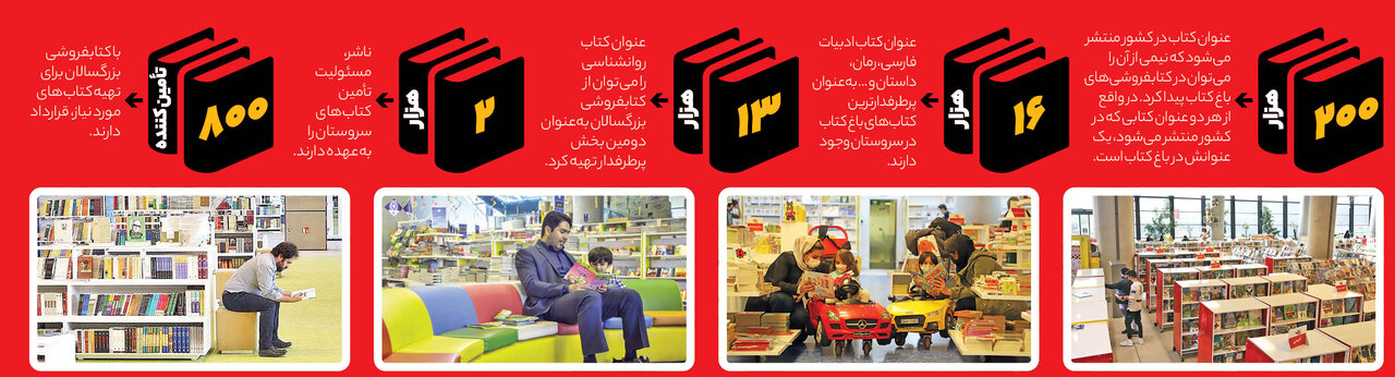 ۲۰۰ هزار عنوان کتاب در کشور منتشر میشود که نیمی از آن را میتوان در کتابفروشیهای باغ کتاب یافت. در واقع از هر ۲ عنوان کتابی که در کشور منتشر میشود، یک عنوان در باغ کتاب هست.