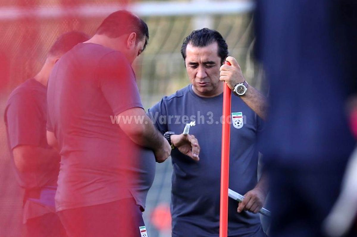 با فاصله ۵۰ ، ۶۰ متری بازیکنان تیم ملی در حالی که کادر فنی پرتعداد امیر قلعهنویی احاطه شده بودند، در حال پاس دادن به یکدیگر در فضایی بسیار فشرده بودند. حمید مطهری مربی فعال این بخش بود و با سوتها و توصیههایش شرایط را کنترل میکرد. رحمان رضایی، مانیکونه، سعید الهویی، خداداد عزیزی و سایر دستیاران امیر قلعهنویی کنار ایستاده بودند و عملکرد بازیکنان را زیر نظر داشتند.
