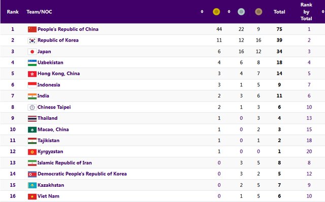 اکنون ایران تا این لحظه با چهار مدال نقره و پنج برنز در رده سیزدهم قرار دارد. البته هنوز مدال نقره تکواندو در جدول اضافه نشده است.