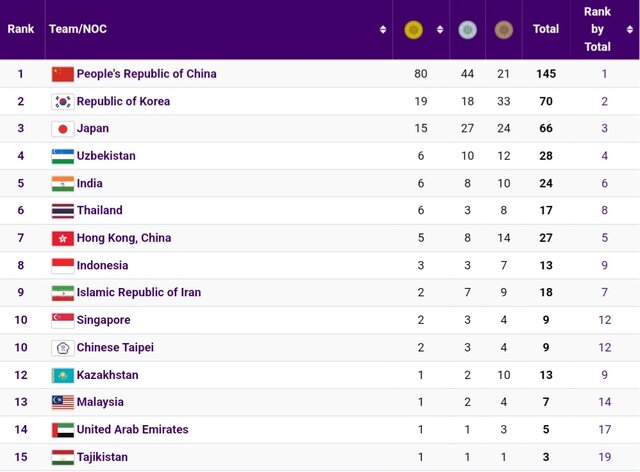 جدول مدالی در روز پنجم بازیهای آسیایی هانگژو (آخرین به روزرسانی ۶:۳۰):