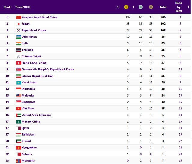 جدول مدالی در روز هفتم بازیهای آسیایی هانگژو: