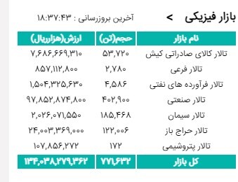 به گزارش خبرگزاری صداوسیما، امروز ۷۷۱ هزار و ۶۳۲ تن انواع کالا و محصول به ارزش ۱۳ هزار و ۴۰۳ میلیارد تومان در بازار فیزیکی بورس کالا دادوستد شد.