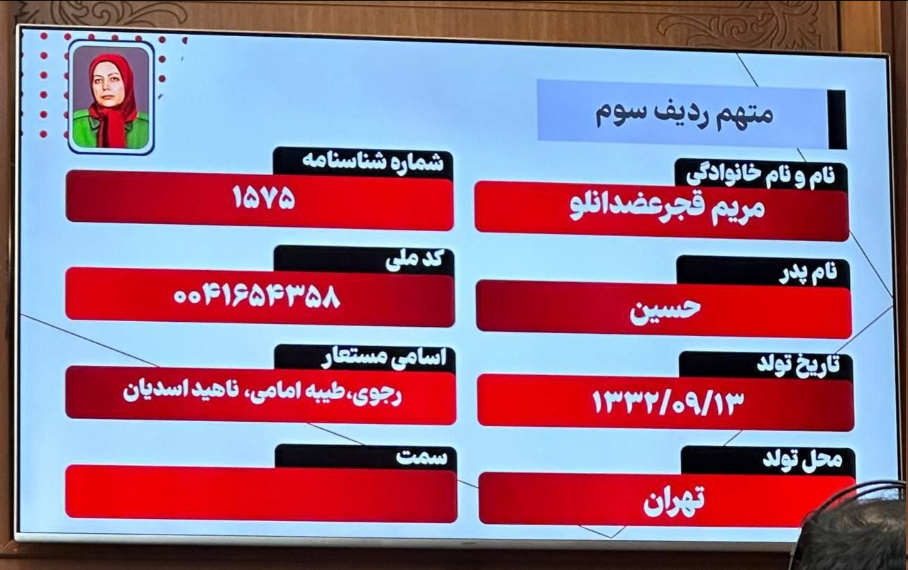 نماینده دادستان ادامه داد: طبق کیفرخواست اعلامشده از سوی دادگاه مریم قجر عضدانلو فرزند حسین با شماره شناسنامه ۱۵۷۵ و کدملی ۰۰۴۱۶۵۴۳۵۸ با نامهای مستعار مریم رجوی، طیبه امامی و ناهید اسدیان متهم ردیف سوم است. نامبرده دارای اعلان قرمز بوده و خود را رئیسجمهور خودخوانده شورای مقاومت میداند. مریم رجوی در ایام جنگ تحمیلی در عملیات آفتاب و فروغ جاویدان نقش موثری داشته و باعث بسیاری از هموطنان شده است.
