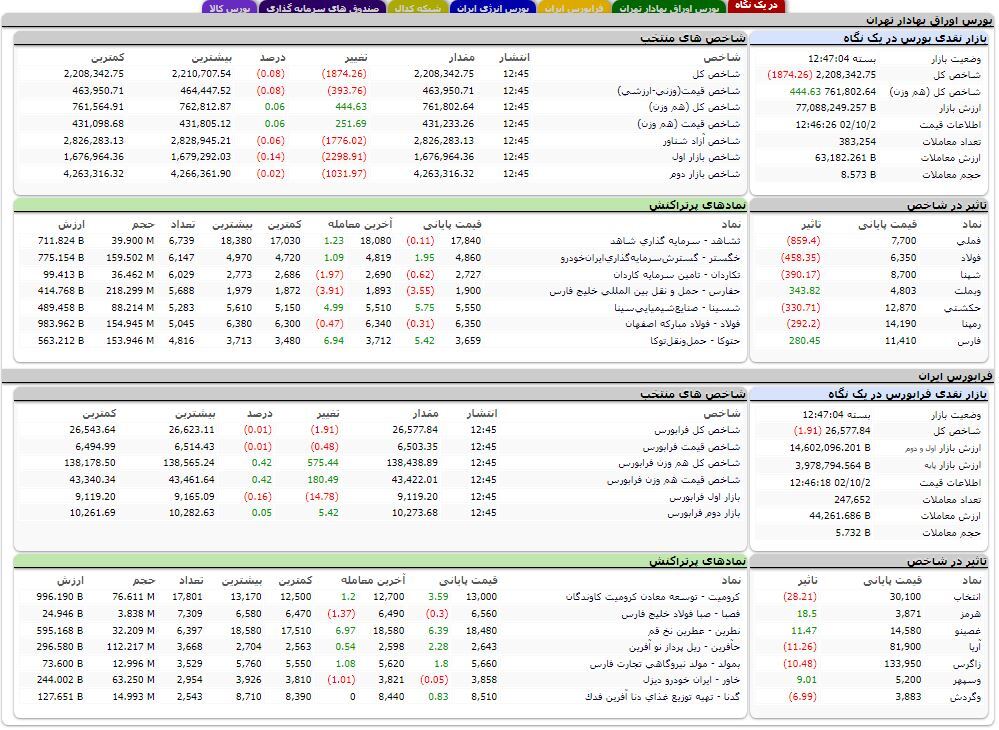 نمادهای فملی، فولاد، شپنا، حکشتی و رمپنا از نمادهای تاثیر گذار منفی بر شاخص کل بورس بودند. اما نماد وبملت، فارس، پارس، شبریز و فاسمین با تاثیر مثبت از کاهش بیشتر شاخص کل ممانعت کرد.