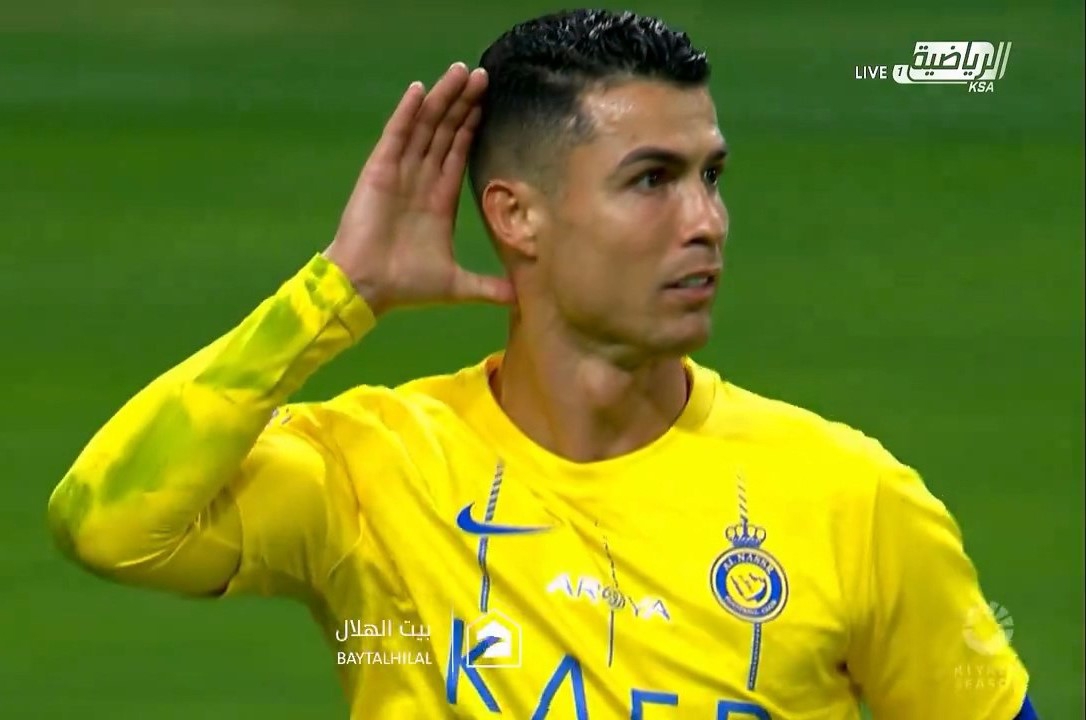 اما دقایقی بعد و با تشویق دوباره مسی، رونالدو دستش را به پشت گوشش برد و اینگونه نشان داد که صدای هواداران الهلال را نمی شنود و از آنها خواست تا با صدای بیشتری به تشویق کاپیتان آرژانتین بپردازند که این تصویر توسط کارگردان تلویزیونی شکار شد.