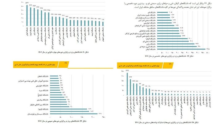 همچنین در این گزارش در بخش بیشترین دوره تخصصی دانشگاه گیلان رتبه اول را نیز کسب نمود. علاوه بر این دانشگاه گیلان در برگزاری دورههای عمومی و برگزاری دورهها با مشارکت واحدهای صنعتی در بین دانشگاههای برتر قرار گرفت.