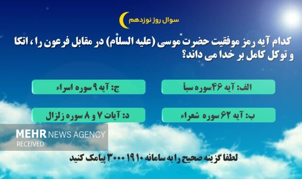 در سوال روز نوزدهم آمده است: کدام آیه رمز موفقیت حضرت موسی (ع) در مقابل فرعون را اتکا و توکل کامل او بر خدا میداند؟