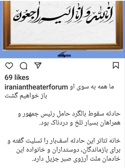 در این پیام که در صفحه رسمی خانه تئاتر منتشر شده، آمده است: حادثه سقوط بالگرد حامل ریس جمهور و همراهان بسیار تلخ و دردناک بود.