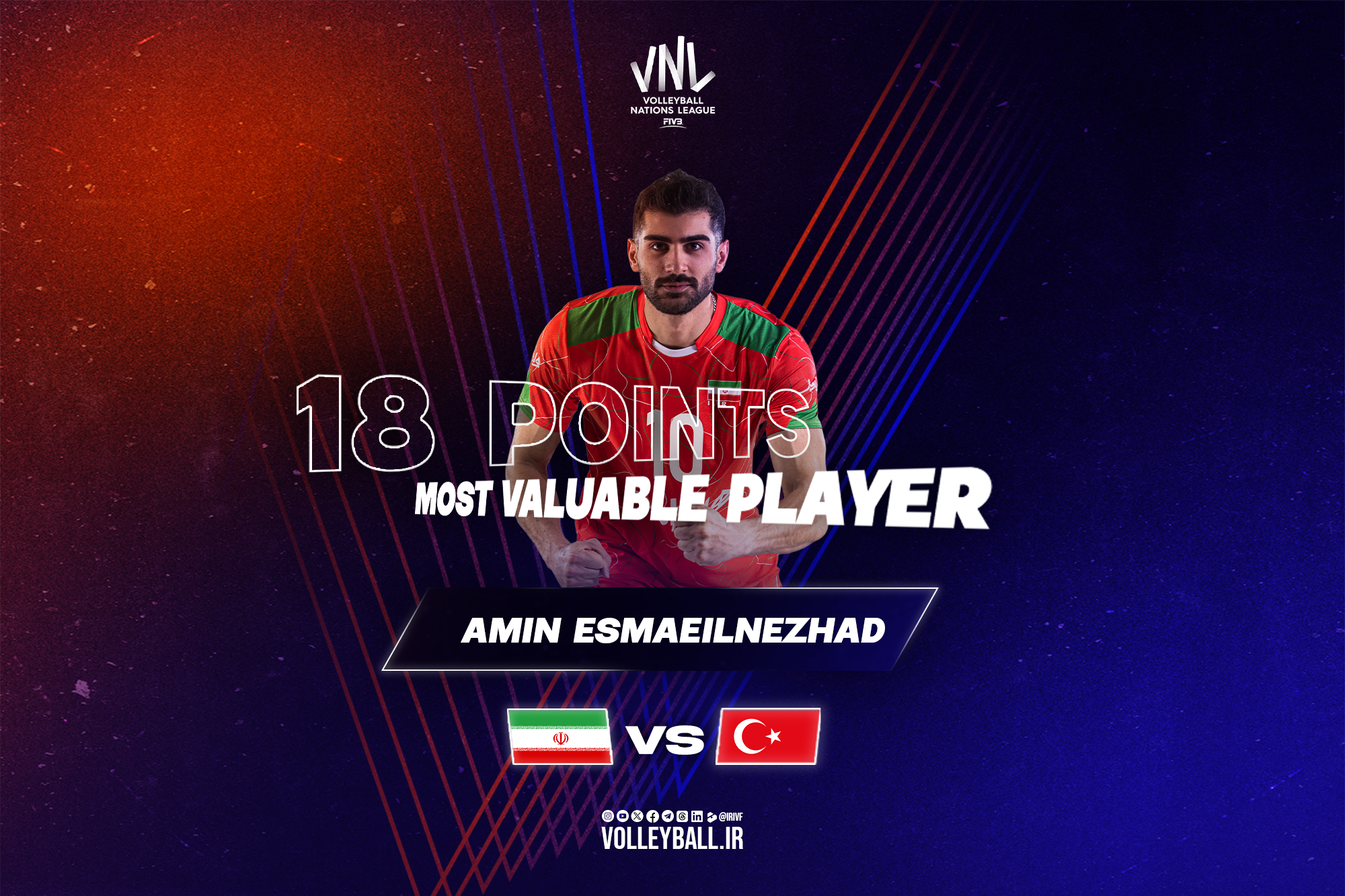 امین اسماعیلنژاد امتیازآورترین بازیکن ایران در دیدار برابر ترکیه در مرحله مقدماتی والیبال لیگ ملتها ۲۰۲۴ شد.
