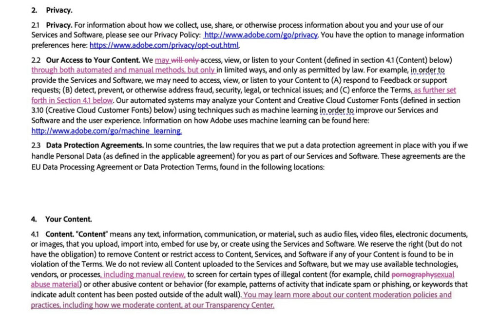 «ادوبی برای دسترسی به محتوای شما صرفاً بهمنظور بهبود عملکرد یا سرویسها و نرمافزارهای خود و همچنین مطابقت با قانون، مانند محافظت در برابر محتواهای توهینآمیز، به مجوز محدودی نیاز دارد.»