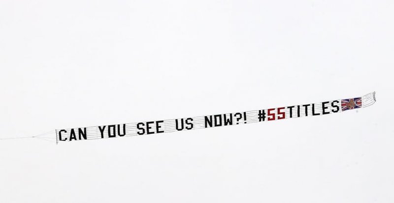 در این بنر بزرگ نوشته بود: "آیا اکنون می توانید ما را ببینید؟! 55 عنوان قهرمانی". این بنر به کسب 55 قهرمانی گلاسکو رنجرز در لیگ برتر اسکاتلند اشاره داشت و هواداران این تیم اینگونه برای رقیب خود کری خواندند.