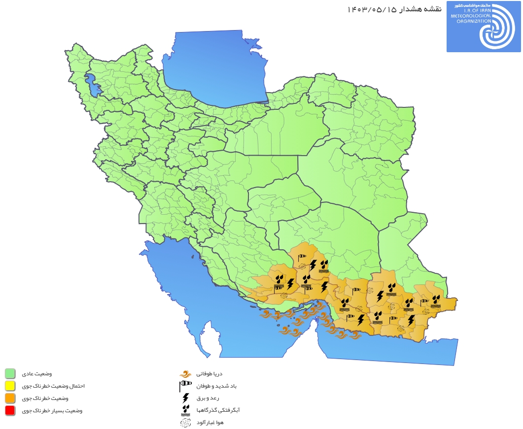 به گزارش خبرگزاری صداو سیما سازمان هواشناسی کشور با صدور هشدار سطح نارنجی، اعلام کرد: فعالیت شدید ناپایداریهای موسمی امروز و فردا در استانهای سیستان و بلوچستان، هرمزگان، کرمان و فارس منجر به سیلابی شدن مسیلها و طغیان رودخانههای فصلی میشود.