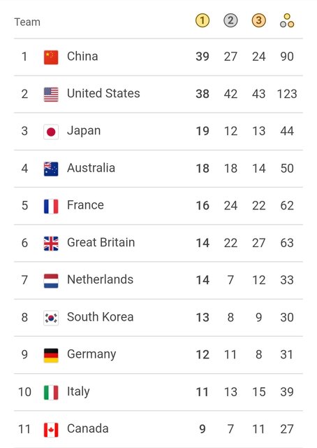 در المپیک ۲۰۲۰ توکیو ایالات متحده با ۳۹ طلا، چین با ۳۸ طلا و ژاپن با ۲۷ طلا اول تا سوم شدند.
